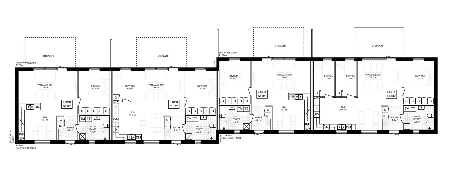 Kombo länga består av fyra st välplanerade lägenheter. Två stycken 2-rumslägenheter på vardera 62,8 kvm, en 3-rumslägenhet på 71,1 kvm samt en 4-rumslägenhet på 82,8 kvm.