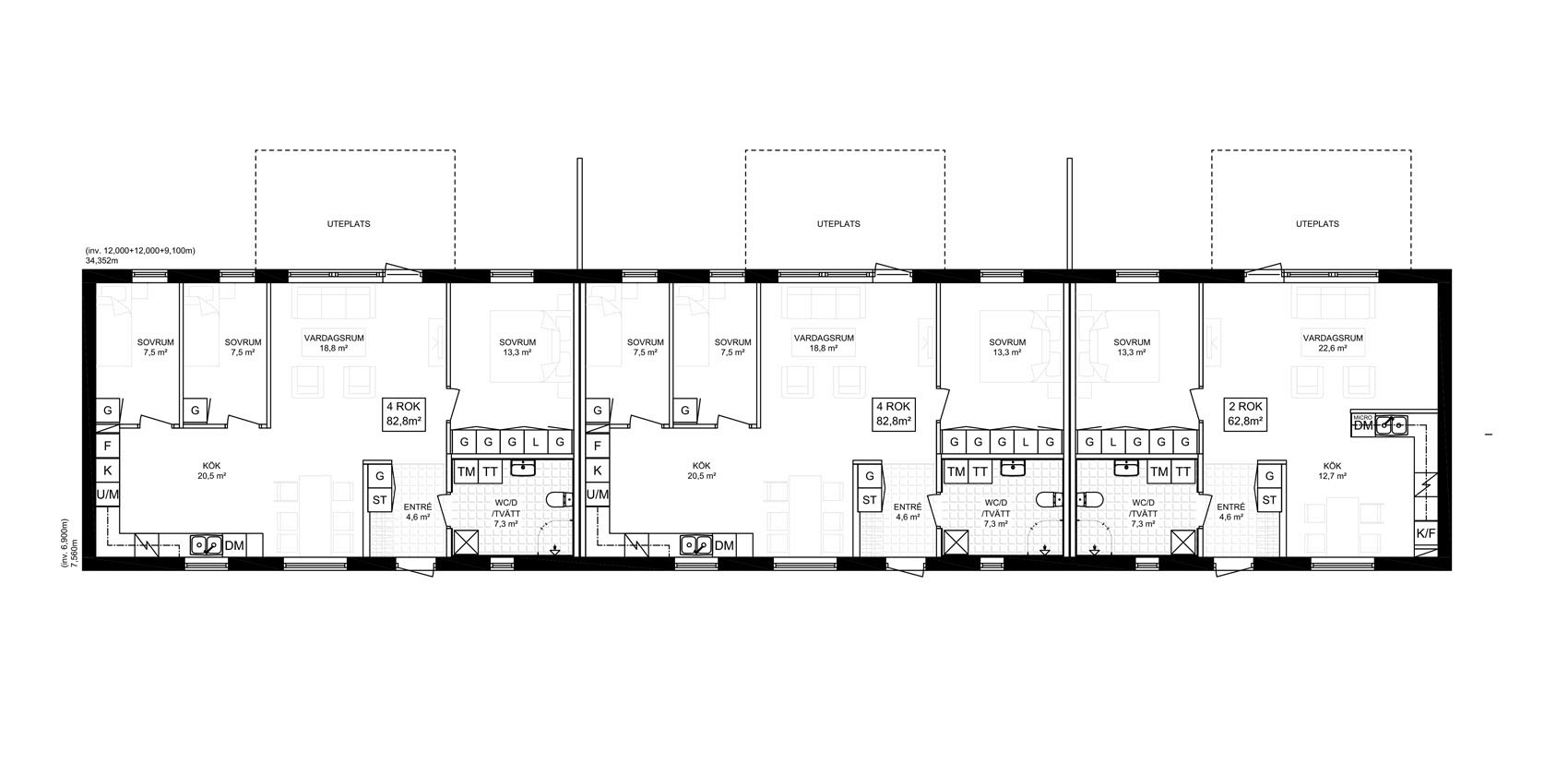 Denna Kombo länga består av 3 st bostäder varav 2 stycken är 3-rumslägenheter på 82,8 kvm samt en är 2-rumslägenhet på 62,8 kvm.