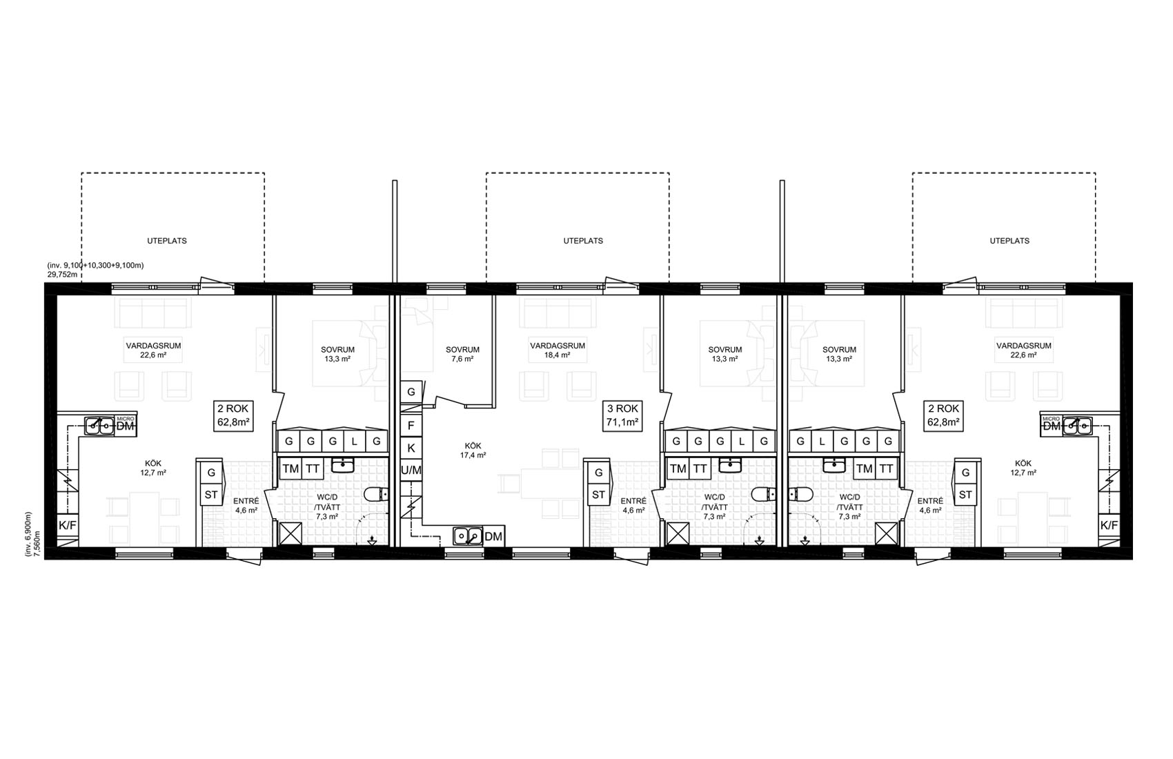 Denna Kombo länga består av tre bostäder fördelade på 2 stycken 2-rumslägenheter på 62,8 kvm samt 1 st 3-rumslägenhet på 71,1 kvm.