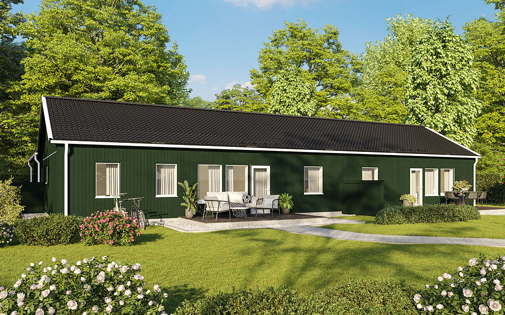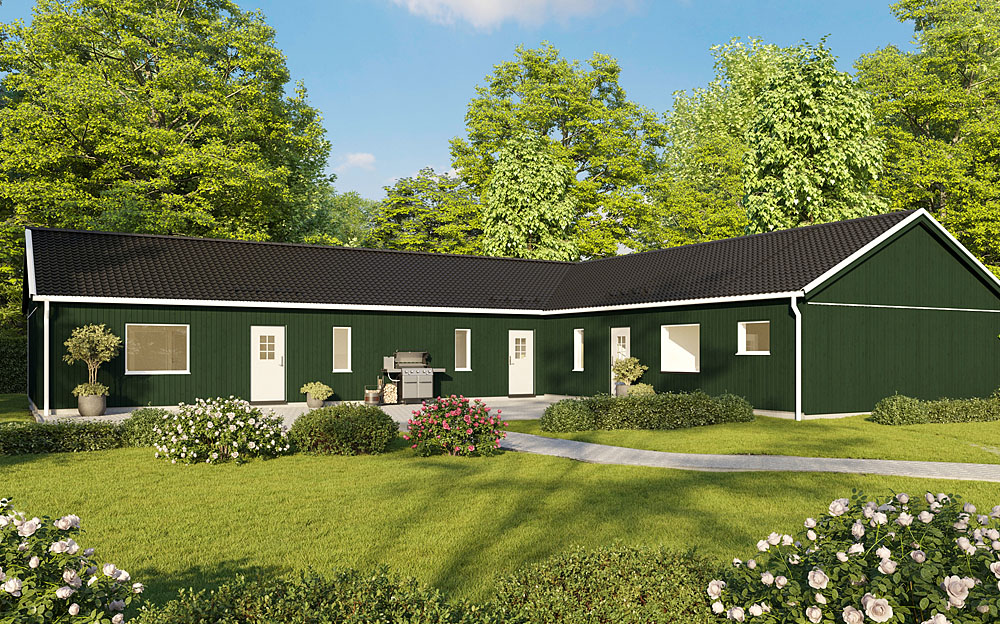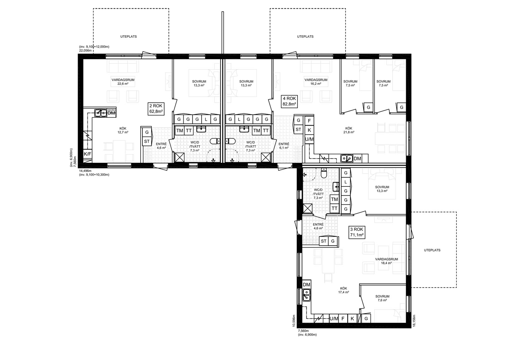 Kombo vinkel är precis som det heter ett enplanshus i vinkel bestående av tre stycken bostäder. 2-rumslägenheten är på 62,8 kvm, 3-rumslägenheten är på 71,1 kvm och 4-rumslägenheten är på 82,8 kvm.